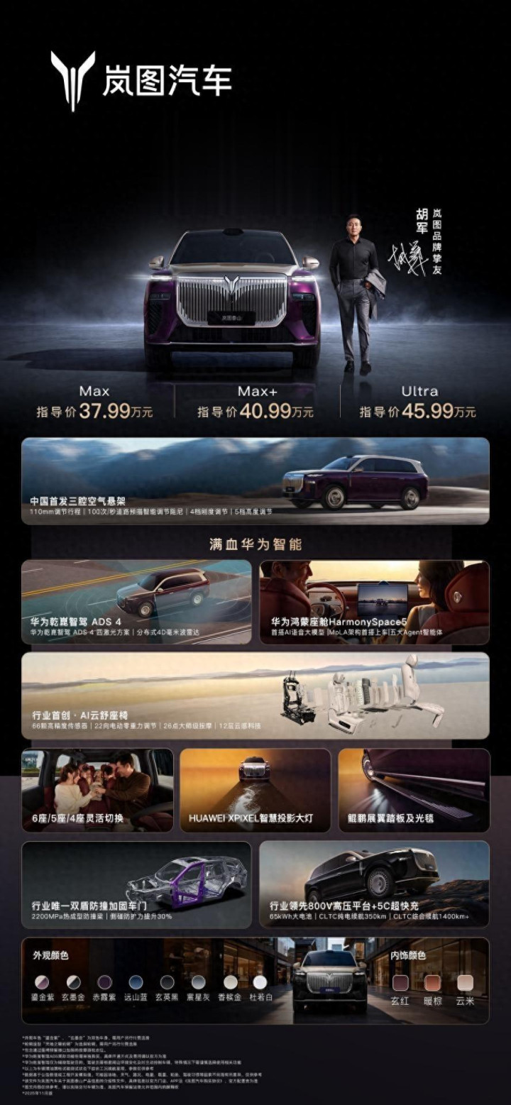 11月18日,岚图汽车在深圳国际会展中心召开以“争峰”为主题的新车发布会,正式发布新时代旗舰SUV——岚图泰山,新车共推出Max版、Max+版、Ultra版、黑武士版四大版型,官方指导价为37.99万元-50.99万元。同时,还公布了总价值4.8万元的上市权益。