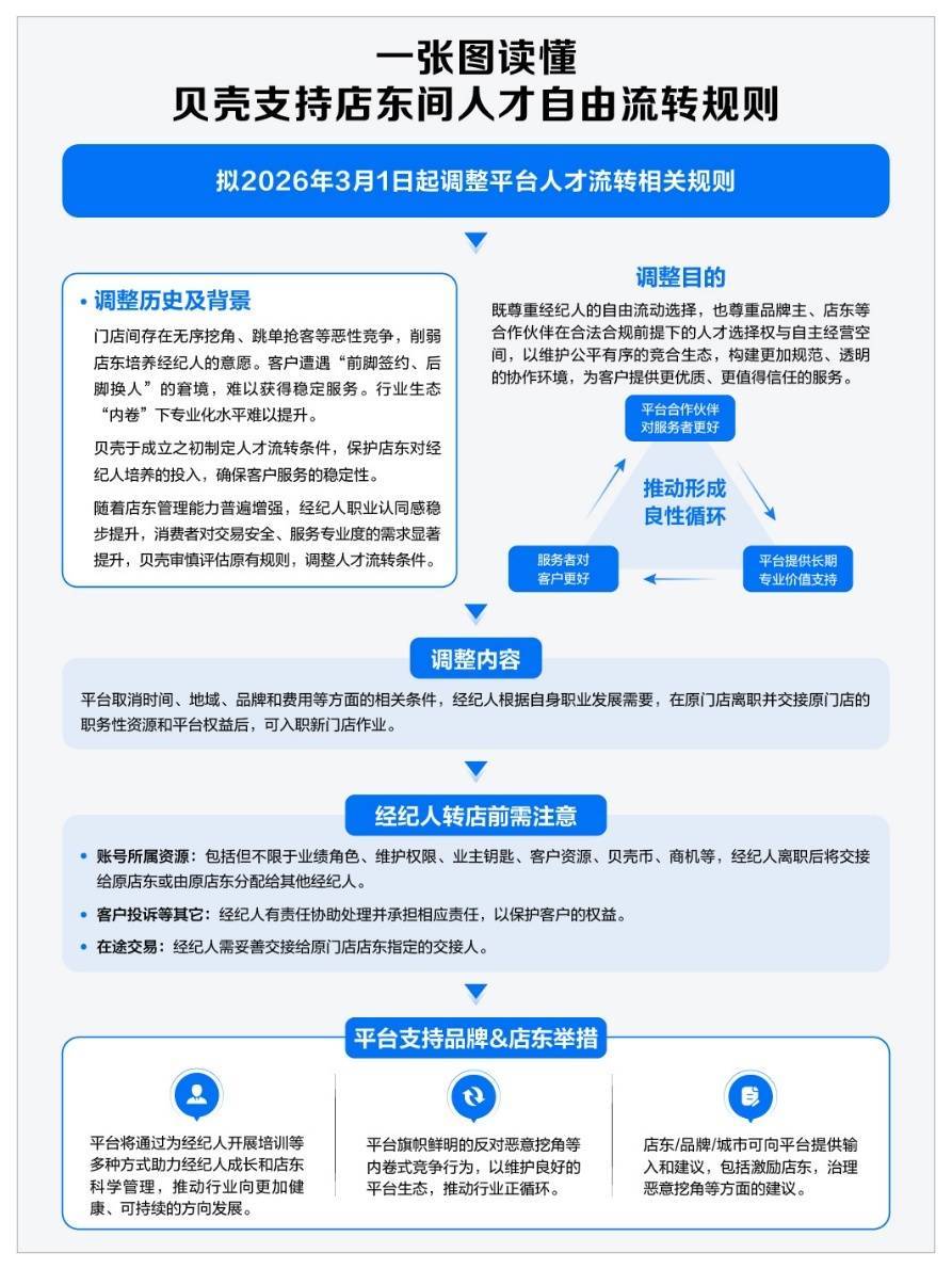 3月1日起,贝壳平台正式放开人才流转相关规则,经纪人在时间、地域、品牌和费用等方面不设条件。即经纪人可根据自身职业发展需要,在平台原门店离职并交接原门店的职务性资源和平台权益后,入职新门店作业。